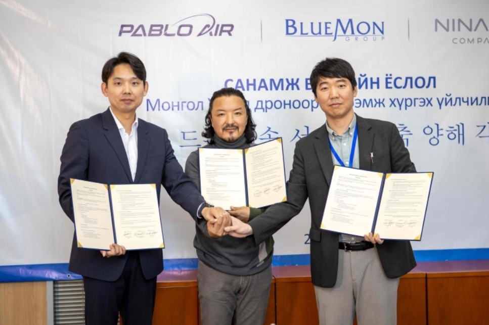 파블로항공은 지난 28일 몽골의 블루몬(BLUEMON) 그룹, ㈜니나노컴퍼니와 함께 울란바토르 도심 드론배송을 위한 양해각서(MOU)를 체결했다고 밝혔다. 블루몬 그룹은 몽골에서 9개의 자회사를 보유하고 식음료, 소매 및 유통, 부동산 등 폭넓은 사업을 전개하고 있는 기업이다.