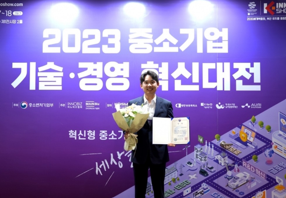 (사진1) 김영준 파블로항공 대표가 18일 부산 벡스코에서 열린 ‘2023 중소기업 기술·경영혁신대전’에서 경영혁신 부문에서 최우수상인 중소벤처기업부 장관상을 수상한 후 기념 촬영을 하고 있다.