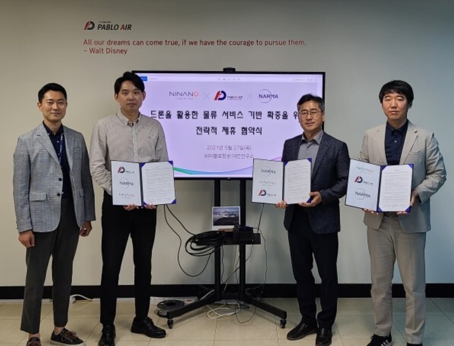 이번 업무협약을 통해 파블로항공은 안정적인 드론 운영을 위한 관제 및 제어, 기타 서비스 솔루션을 담당한다. 니나노컴퍼니는 고중량 대형 드론 제작을 비롯해 드론을 통한 물류혁신의 요충지로 주목받는 경상북도 김천시 내 드론 활용 물류 서비스를 제공하고, 나르마는 틸트로터 기반 기체 공급을 담당할 예정이다.